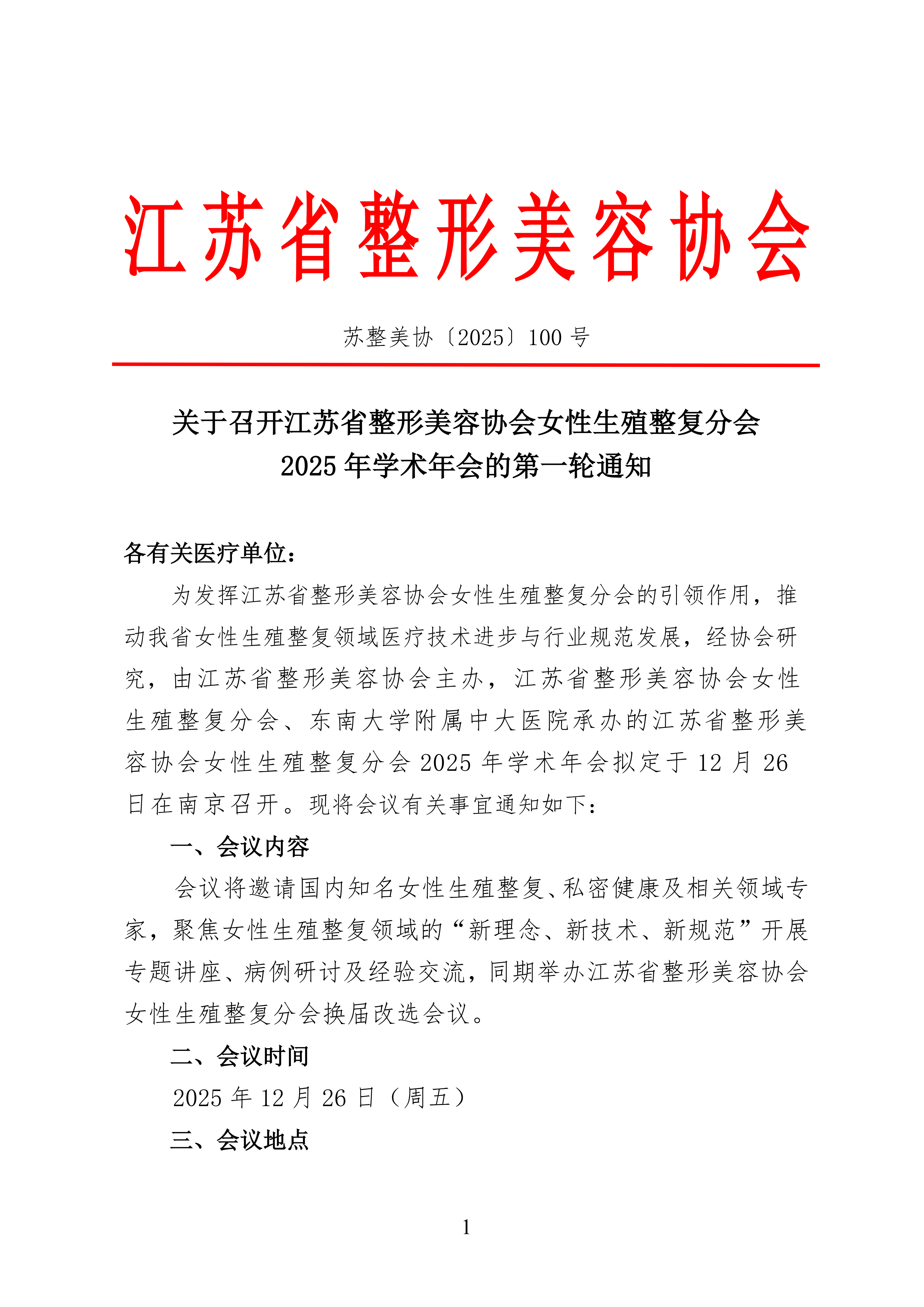 关于召开江苏省整形美容协会女性生殖整复分会2025年学术年会的第一轮通知
