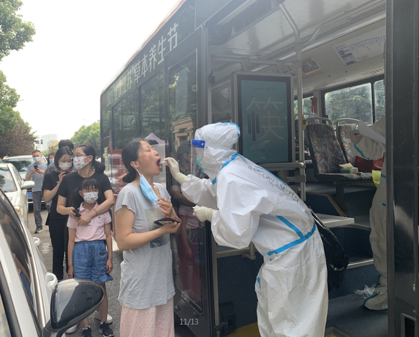 7月31日,继续战斗。尽管建邺区做了巨大努力,仍然有部分市民未能及时参与第三次全市核酸筛查,于是建邺区卫健委决定今天组织100辆公共汽车成为一百个临时的移动核酸检测点,因此就需要100名采样熟练的护士。转发了卫健委的电话精神后,我们的医护人员没有犹豫!只说了一个字:行!她们今天的任务是:一台公交车、一名护士就是一个流动检测采样点,然后一个小区一个小区检测,从中午的12:00直到晚上8点!她们是南京展超医疗的护士总长周庆蕊、护士尹丽芳、护士刘吕!她们是南京抗疫志愿者大军中三位普通护士!就像南京城墙中毫不显眼的三块砖:无声,但很质感!