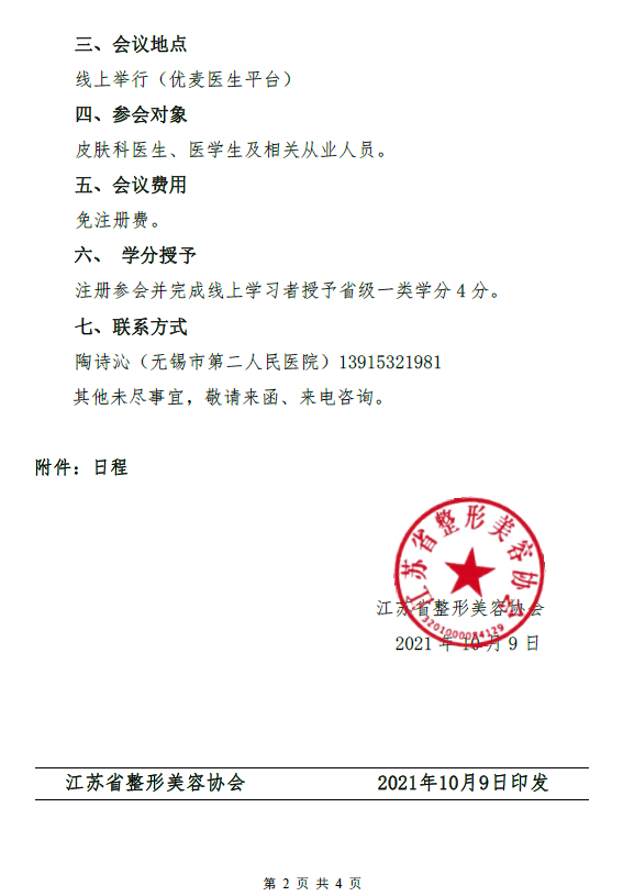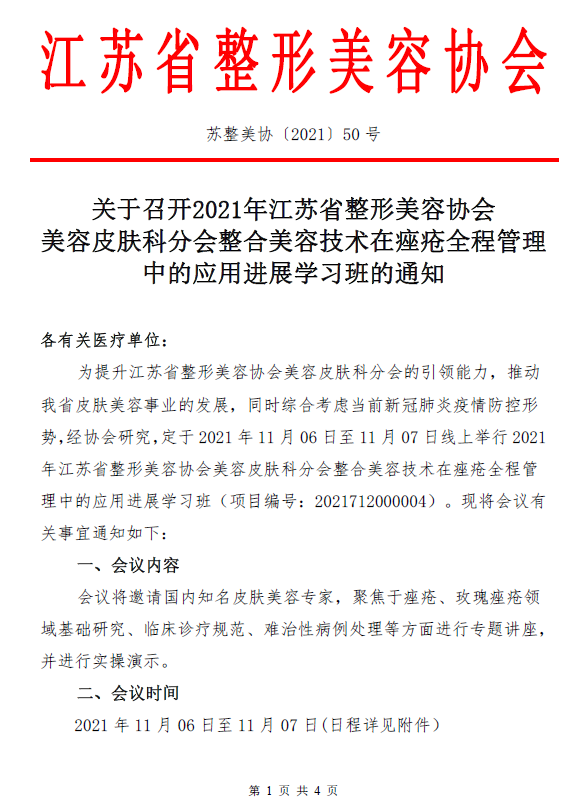 关于召开2021年江苏省整形美容协会美容皮肤科分会整合美容技术在痤疮全程管理中的应用进展学习班的通知