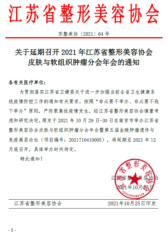 关于延期召开2021年江苏省整形美容协会皮肤与软组织肿瘤分会年会的通知